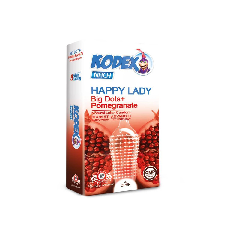 کاندوم کدکس هپی لیدی خاردار بزرگ علاوه بر اینکه دارای خارهایی درشت به همراه حاوی مواد روان کننده جهت مقاربت بدون درد می باشد دارای عصاره ی انار با خاصیت تنگ کنندگی برای ایجاد لذت بیشتر نیز هست این محصول اسانس تحریک کننده با رایحه ی مطبوع دارد.