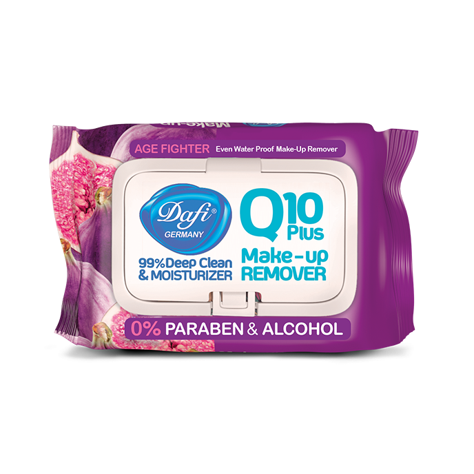 دستمال مرطوب Q10 طرح میوه انجیر دافی، فاقد الکل، صابون و پارابن بوده و حاوی ویتامین A، C، اسیدهای چرب Omega3 و مواد معدنی برای حفظ رطوبت و جلوگیری از پیری پوست میباشد. این دستمال مرطوب آرایش پاککن، همچنین نقش ضدالتهابی داشته و برای صورت و چشم مناسب است. این محصول با قدرت بالا در آبرسانی و پاککنندگی، از ایجاد پیری زودرس و ایجاد منافذ باز ناشی از مواد آرایشی جلوگیری میکند.