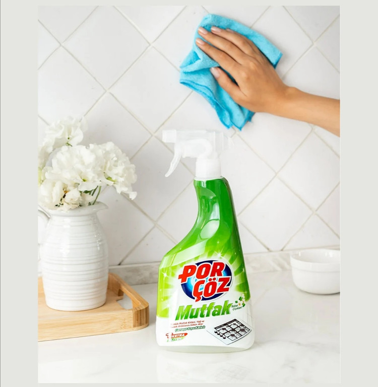 - اسپری Porçöz Kitchen را روی سطح کثیف اسپری کنید و سپس آن را با یک پارچه یا اسفنج مرطوب پاک کنید.