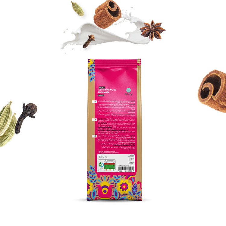 ترکیبات: پودر شکر سفید، شیر خشک بدون چربی، چای فوری، دارچین، جوز هندی، کربوکسی متیل سلولز، وانیل، میخک، زنجبیل