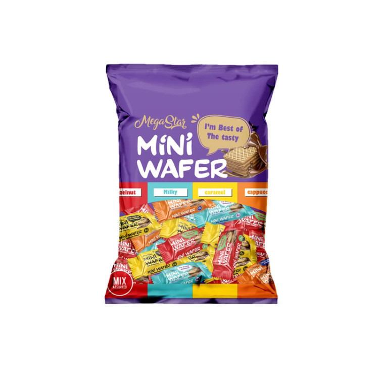 مینی ویفر مگا استار روکش شکلاتی در 4 طعم فندقی – کارامل – کاپوچینو و شیری که در بسته بندی بسیار زیبا و جذاب
