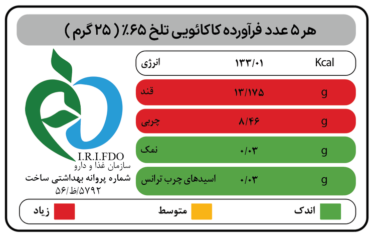 ارزش غذایی در 5 عدد کاکائو 60% (25 گرم )