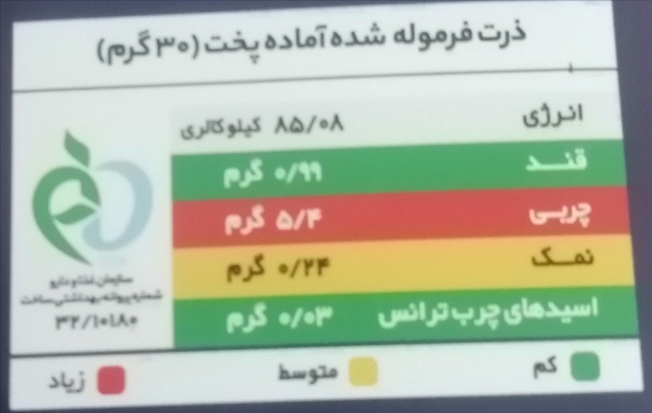 مواد تشکیل دهنده ذرت، روغن مخصوص قنادی، روغن کره (حیوانی)، نمک ارزش غذایی : انرژی: 85.08 کالری چربی: 5.4 گرم قند: 0.99 گرم نمک: 0.24 گرم